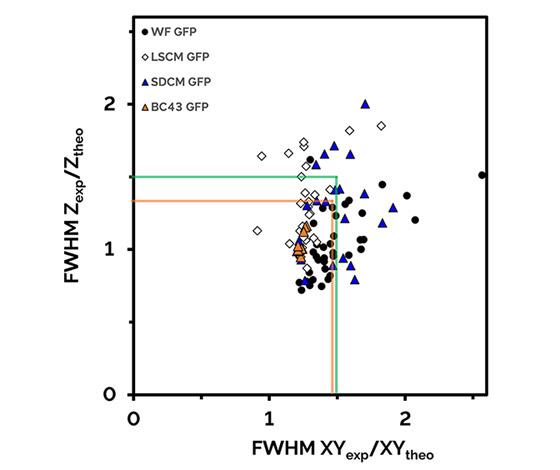 示例中橙色线表示使用60x 1.42 NA油浸物镜时,Andor保证的最小分辨率比值(横向1.47和轴向1.34)。橙色三角形标记表示使用同种物镜和相同BC43仪器配置测得的分辨率数据。该图是根据QUAREP提供的数据和规格制定的。