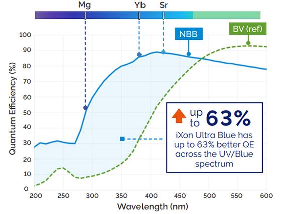 全新的 iXon Ultra Blue 是全球对蓝光和近紫外光子最灵敏的探测器,它兼具单光子灵敏度,且在 200–450 纳米波段的量子效率显著提升。因此,该探测器非常适合离子阱量子系统的成像,尤其适用于镱(370 纳米)、镁(285 纳米)或锶(422 纳米)等离子的成像。