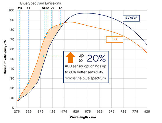 新的“BB”芯片选项对整个光谱蓝色区域的量子效率提高了 20%,非常适合量子光学中离子阱的快速成像,这是一种重要的量子比特计算方法。
