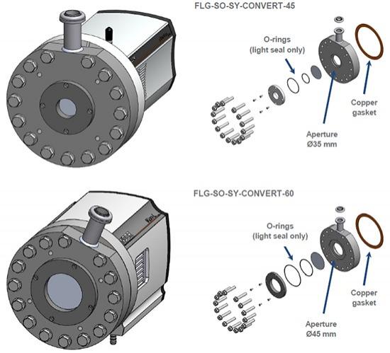 FLG-SO-SY-CONVERT-45 mounts onto the Newton and iKon-M ‘SO’ camera series. FLG-SO-SY-CONVERT-60 mounts onto the iKon-L ‘SO’ camera series. The vacuum sealing interface is a knife-edge.